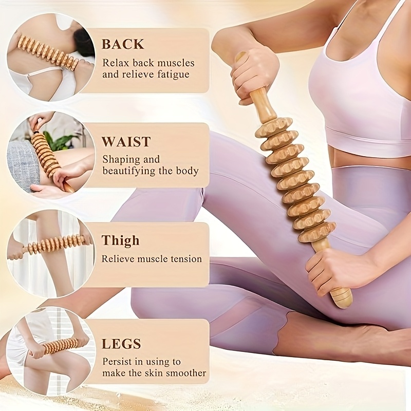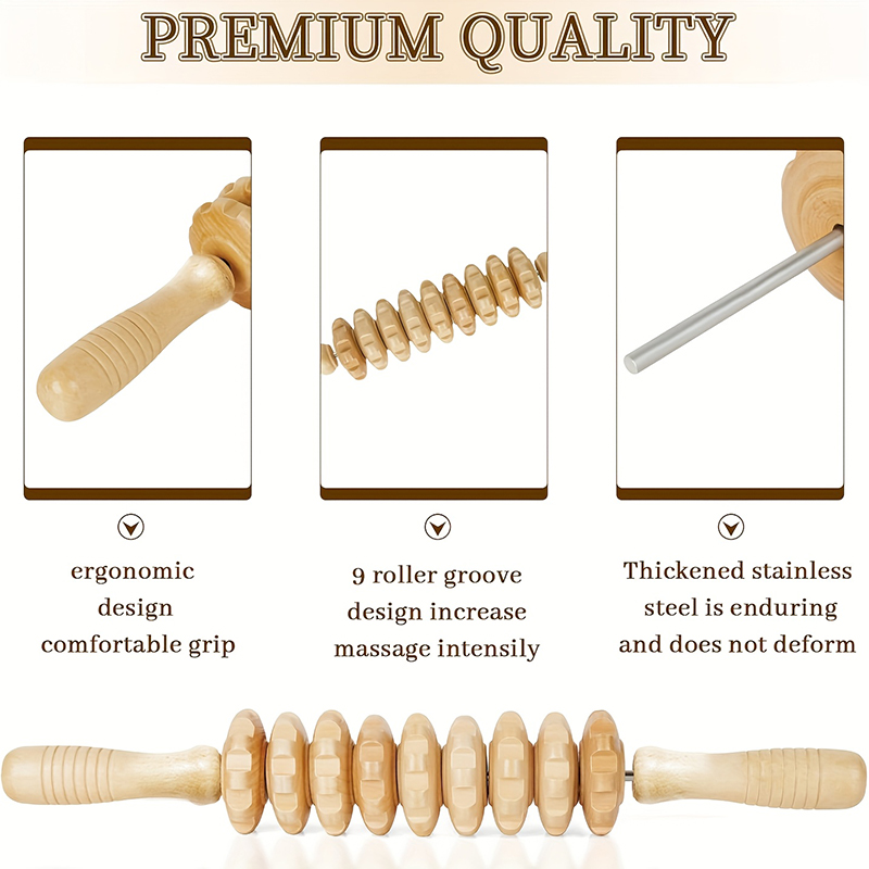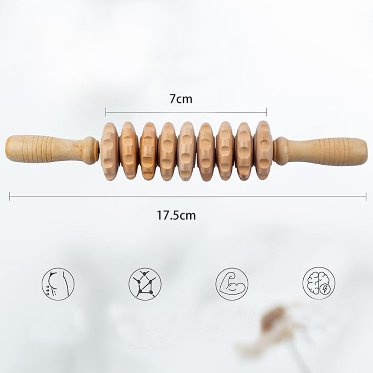 This natural wooden multi-roller massager is crafted with premium wood, featuring 9 textured rollers and an ergonomic dual-handle design. It’s engineered for full-body use, targeting areas like the back, legs, arms, and shoulders. The rolling action stimulates blood circulation, relieves muscle tension, reduces stiffness, and aids in lymphatic drainage.